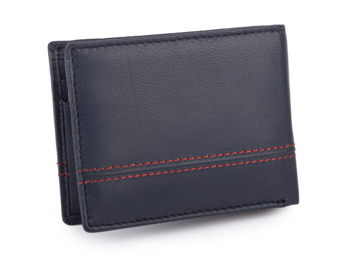 • Zgrabny, granatowy portfel męski z miękkiej skóry naturalnej z subtelnym detalem w postaci kontrastowego, czerwonego przeszycia.