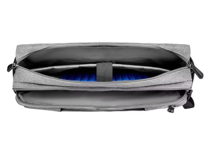 - Duża torba na laptopa w kolorze szarym z czarnymi wstawkami.