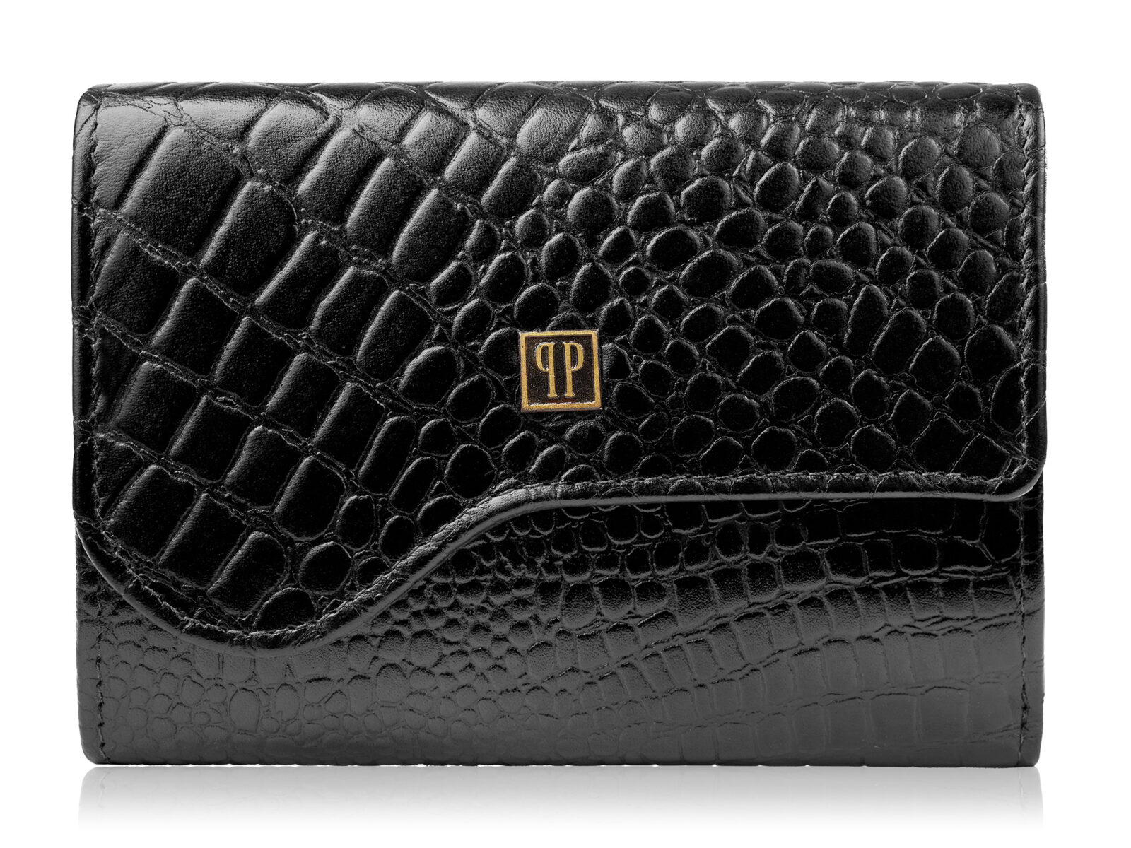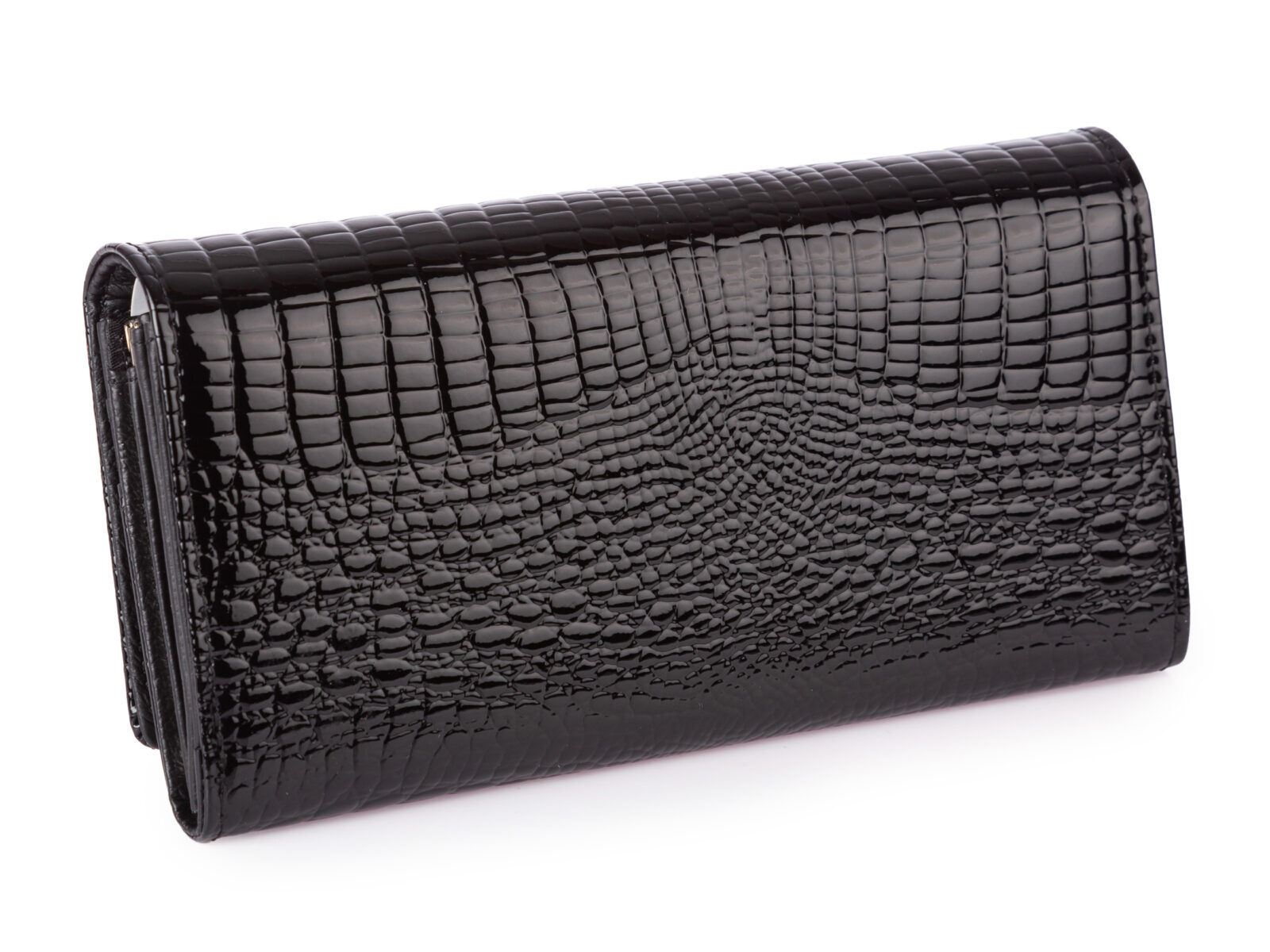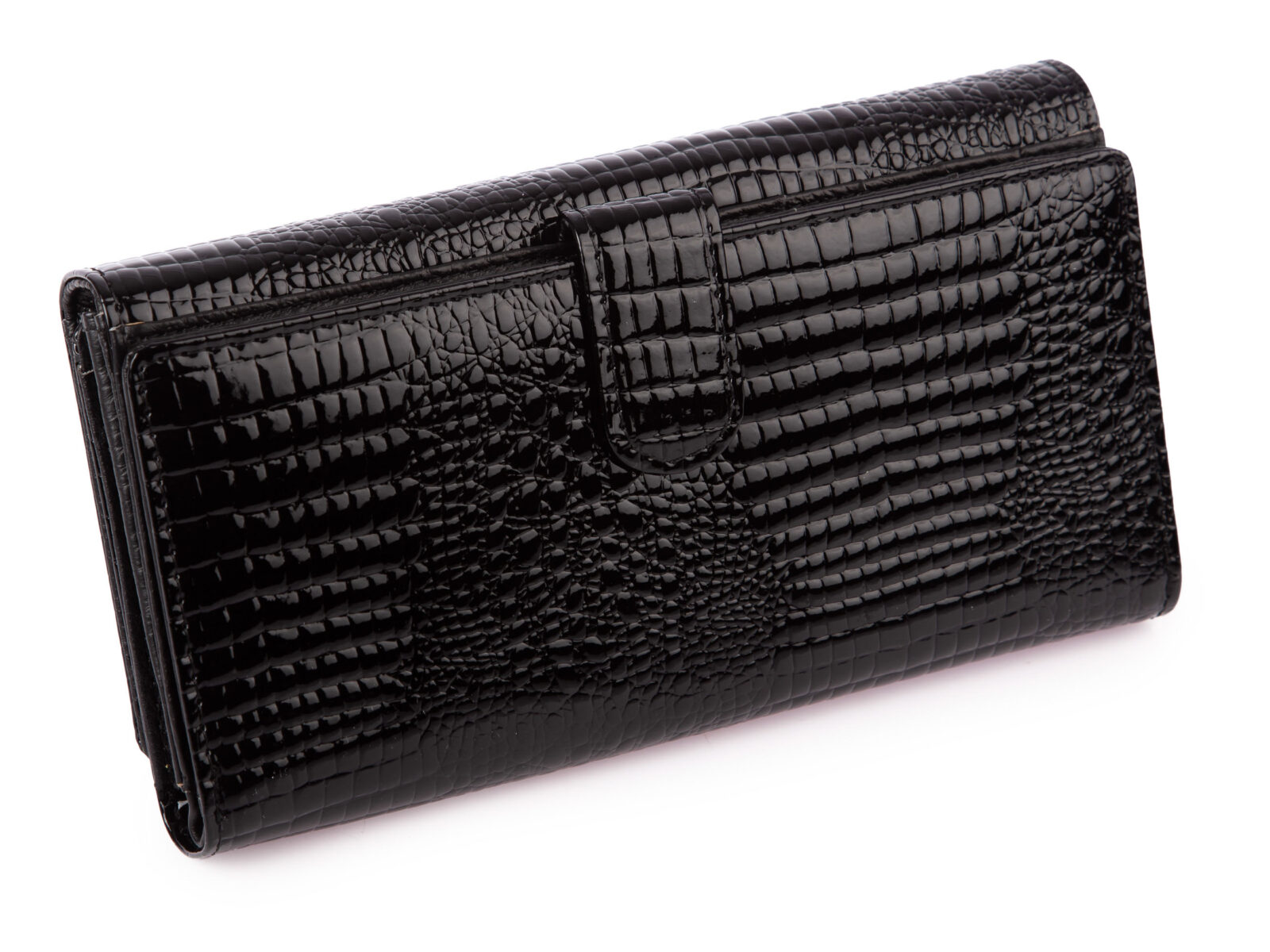 Portfel damski czarny lakierowany z kieszenią zapinaną na bigiel wewnątrz RFID