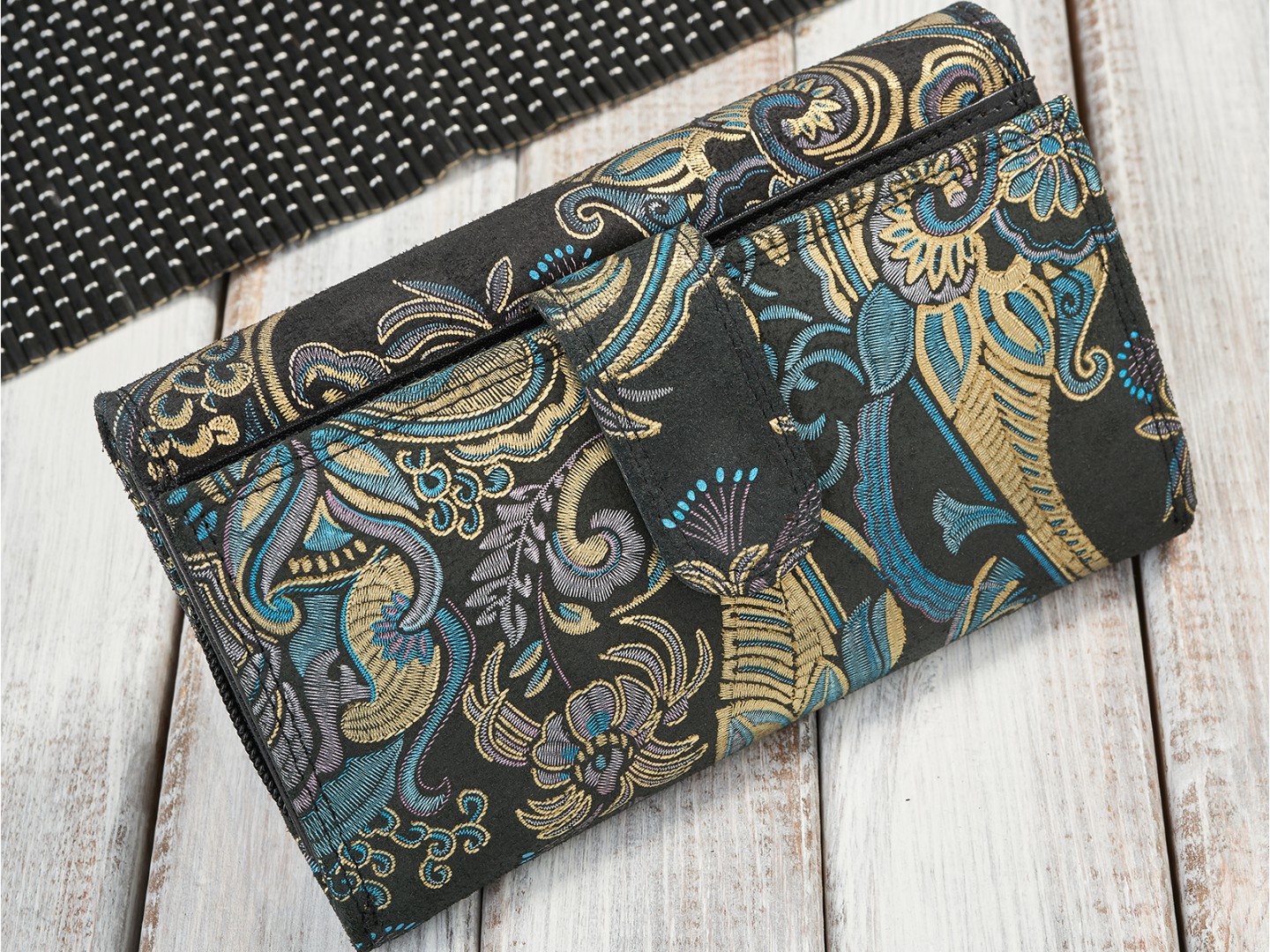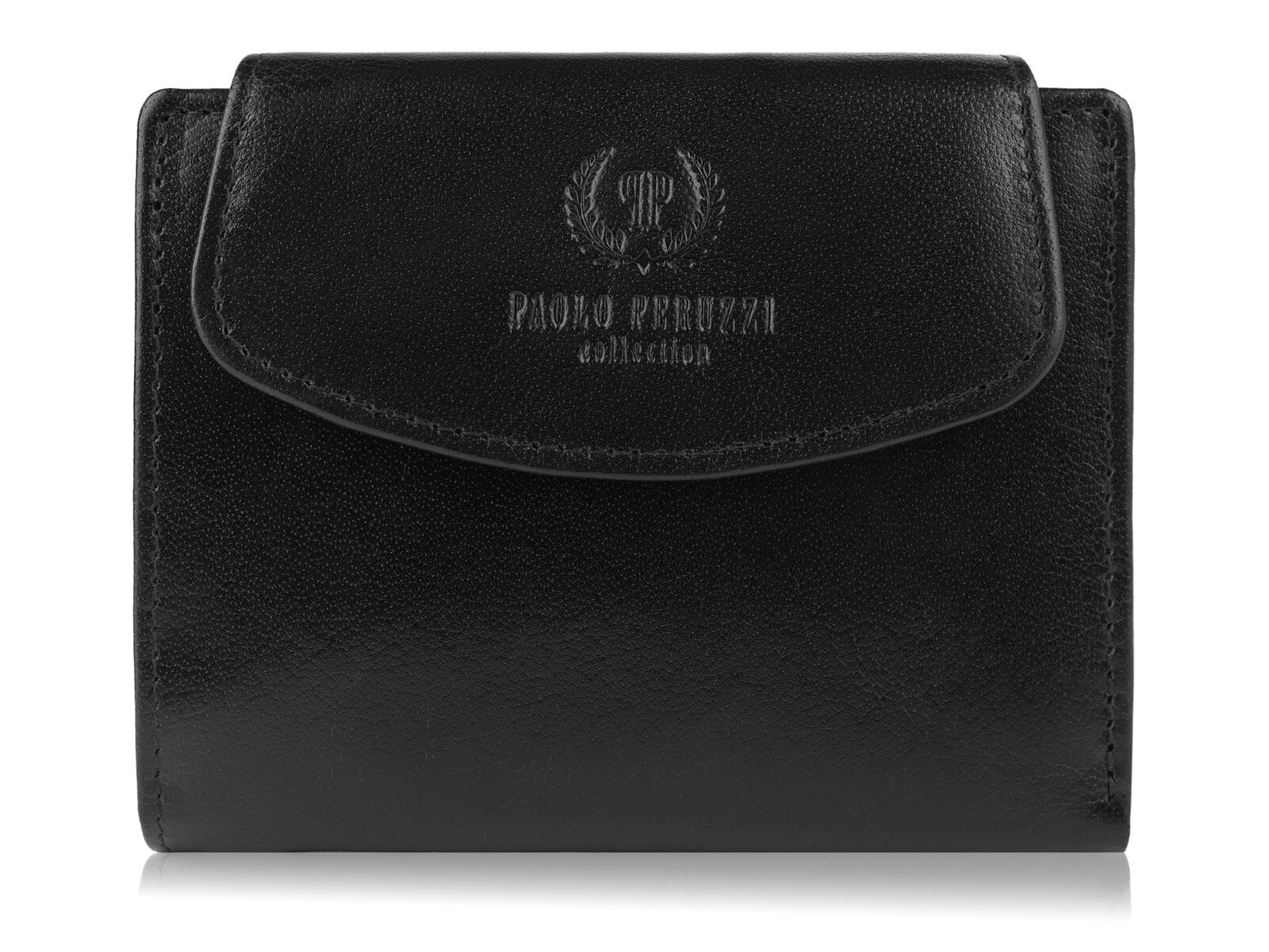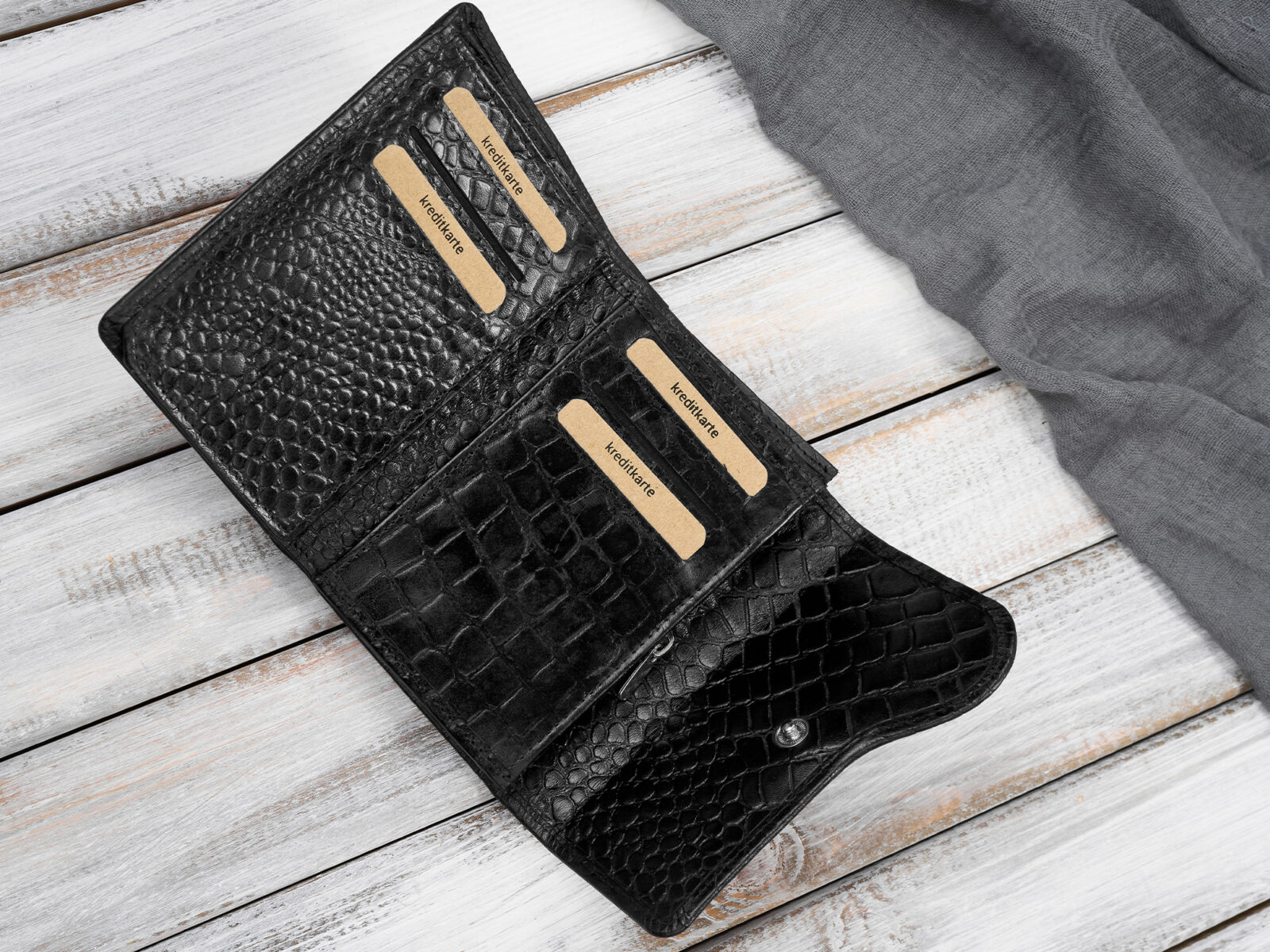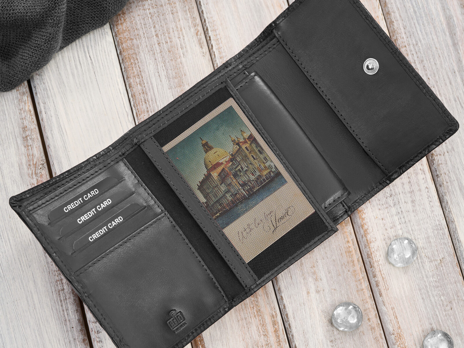 Portfel damski czarny lakierowany z kieszenią zapinaną na bigiel wewnątrz RFID