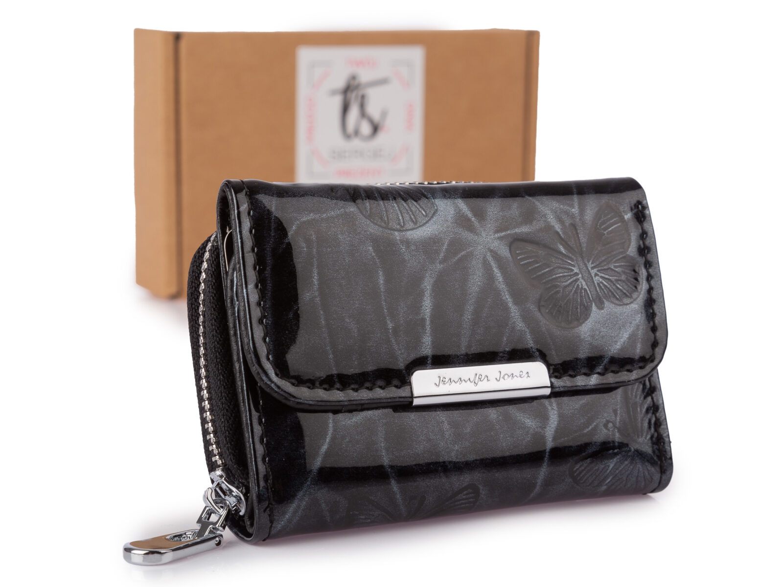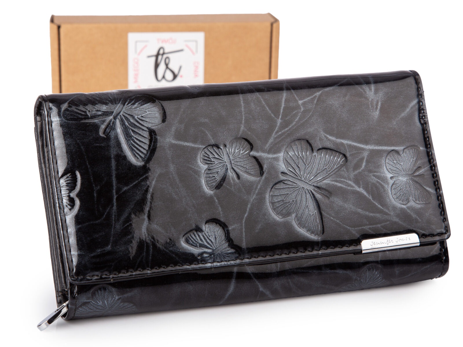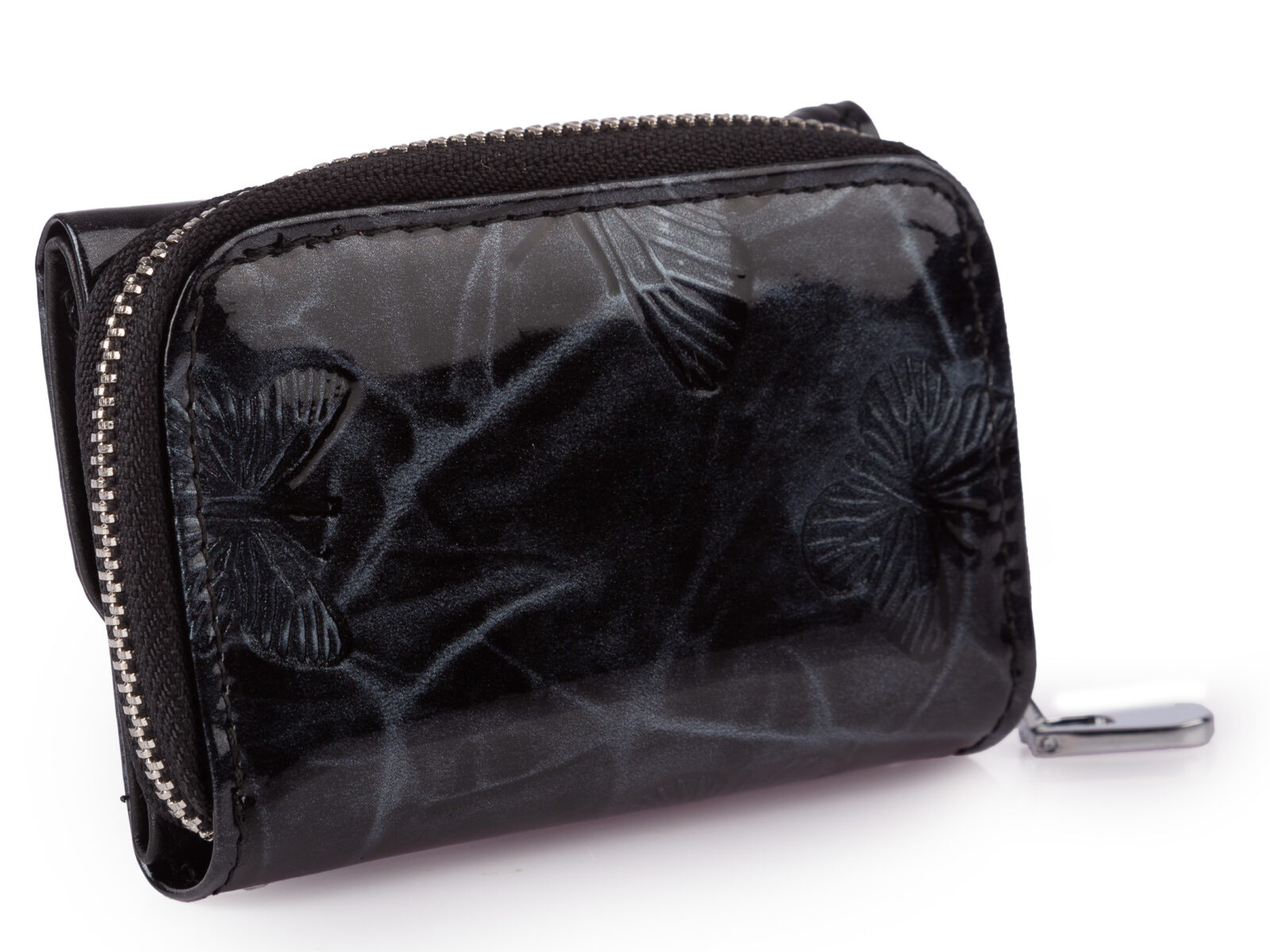 Mała portmonetka damska lakierowana czarna z motylkami Jennifer Jones