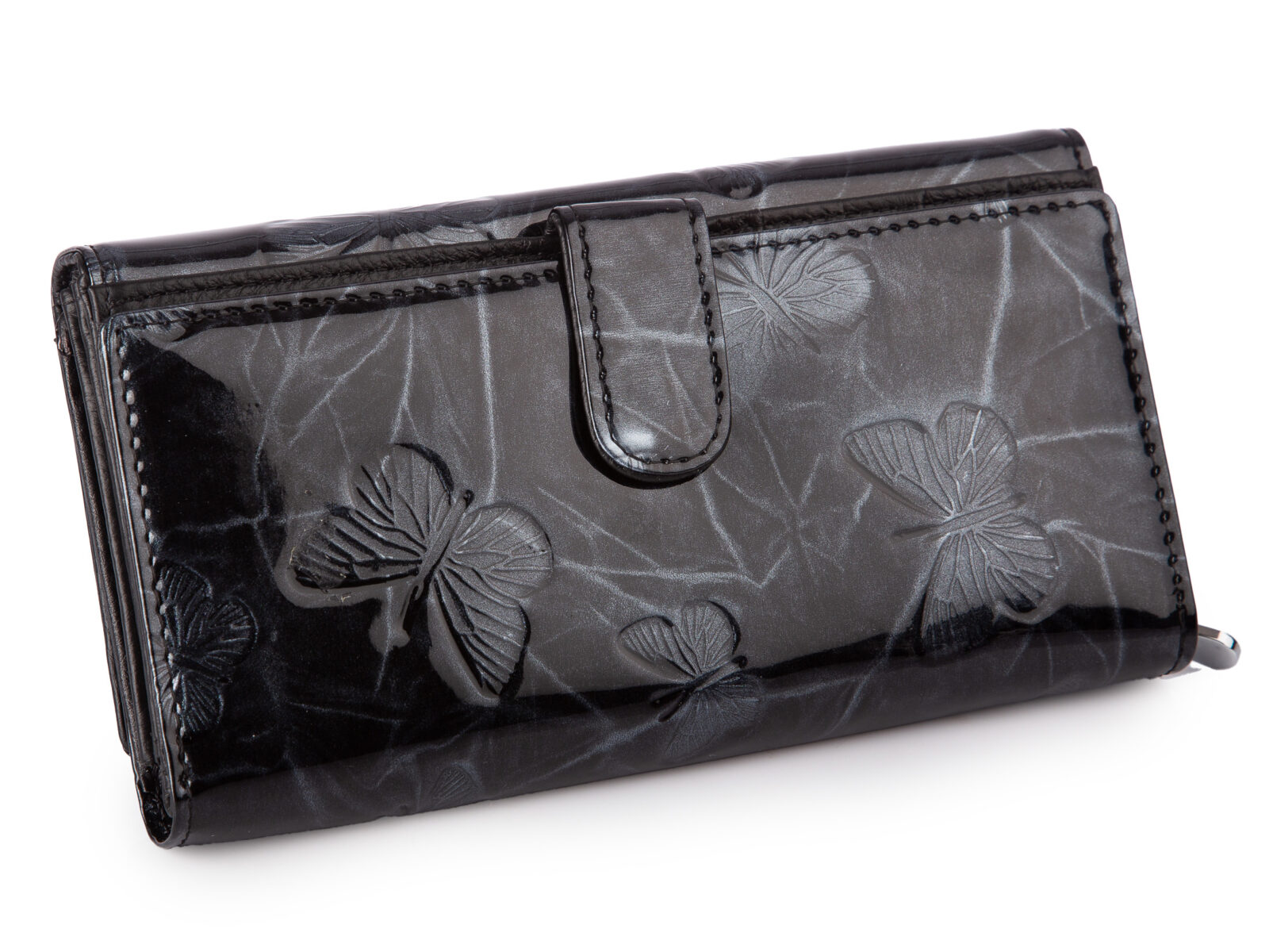 Duży portfel damski lakierowany w motylki, czarny, skórzany z RFID