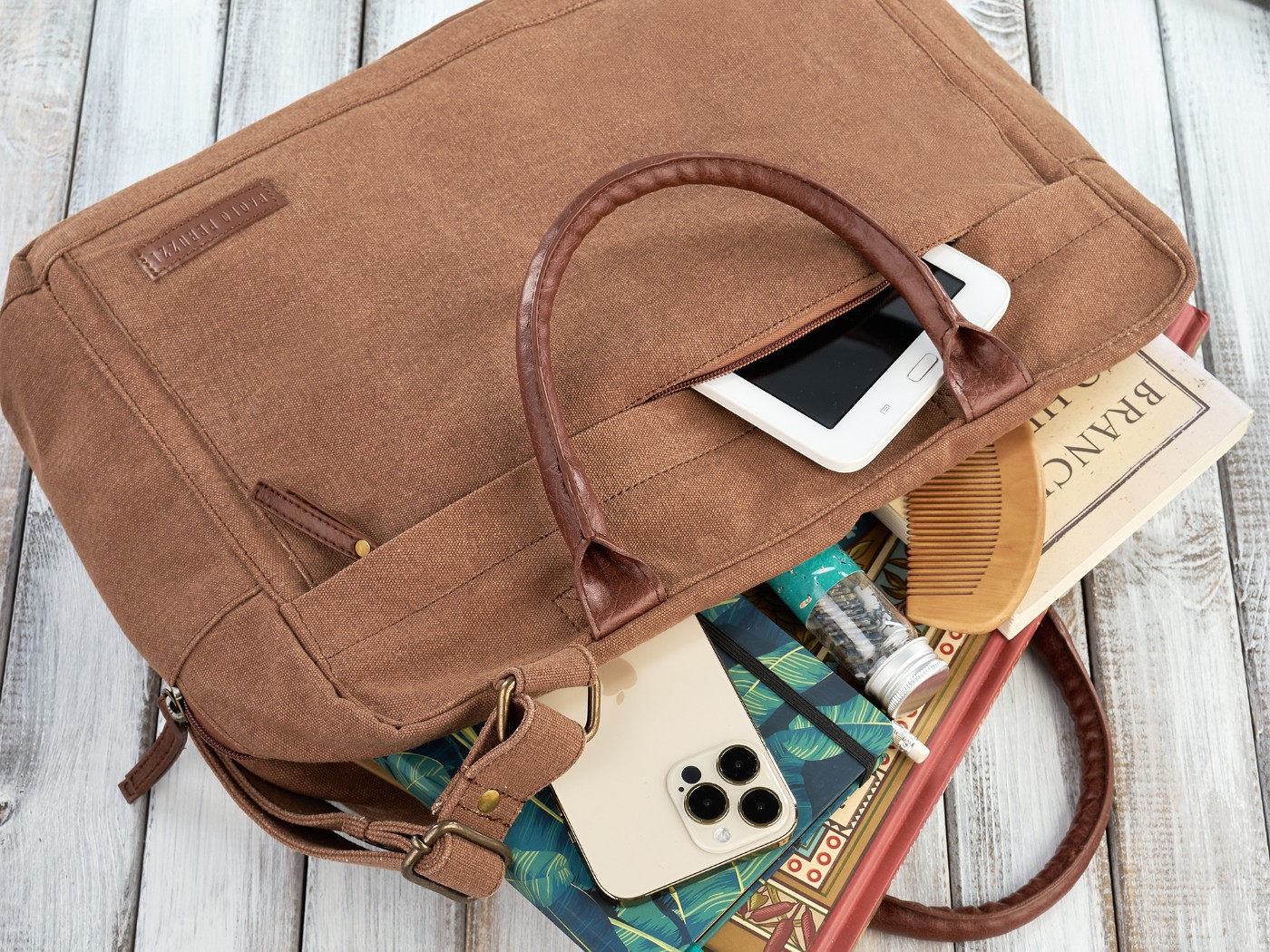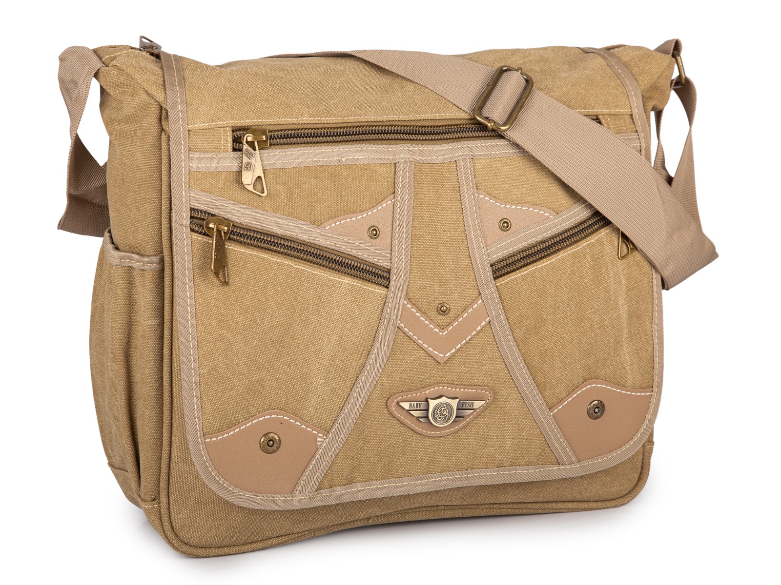 Duża beżowa torba męska na ramię A4 w stylu vintage z kieszenią na laptopa 16"