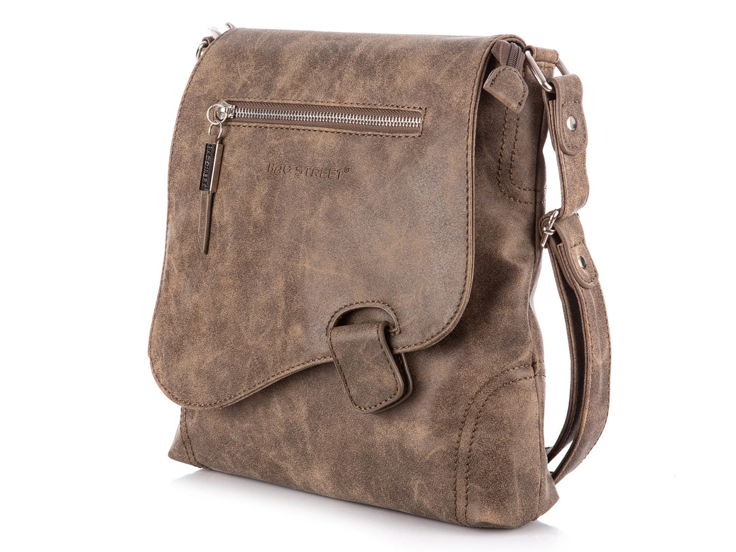 Torebka damska typu raportówka Bag Street wykonana z miękkiej skóry ekologicznej z klapką i oryginalnym zapięciem. Z przodu nieregularna klapka z kieszonką zapinaną na suwak. W zestawie regulowany pasek na ramię.