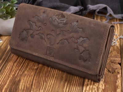 Pierwotna cena wynosiła: 109,99 zł.99,99 złAktualna cena wynosi: 99,99 zł. BruttoPortfel skórzany damski w stylu vintage z kwiatowym motywem – brązowy Blue Burry RFID