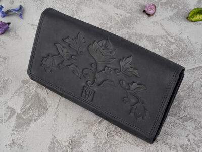 Pierwotna cena wynosiła: 119,99 zł.99,99 złAktualna cena wynosi: 99,99 zł. BruttoCzarny mały portfel damski skórzany z kwiatowym wzorem szyty ręcznie RFID