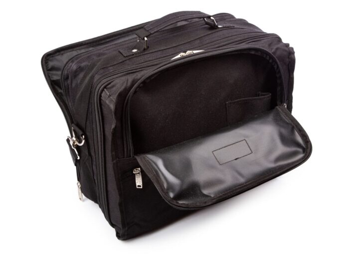 - Tylną kieszeń wyposażono w przegrody na dokumenty A4, oraz w organizer na przybory do pisania.