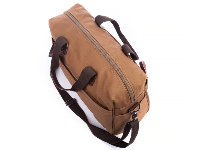 - Uszyta z wysokogatunkowego, mocnego i grubego płótna (canvasu) i miękkiej skóry ekologicznej w kolorze brązowym.