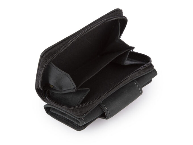 - Mimo małych rozmiarów, portfel wyposażono w przestronną i dzieloną na pół kieszeń na monety zapinaną dookoła na zamek błyskawiczny.