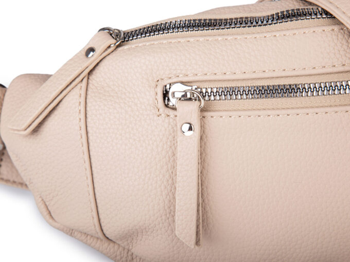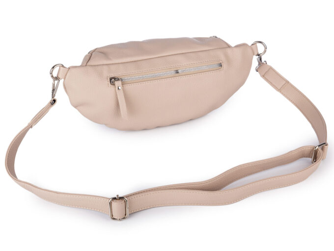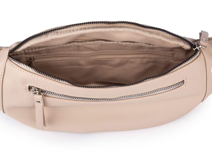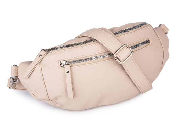 - Duża jasnobeżowa saszetka damska typu nerka z paskiem na ramię.