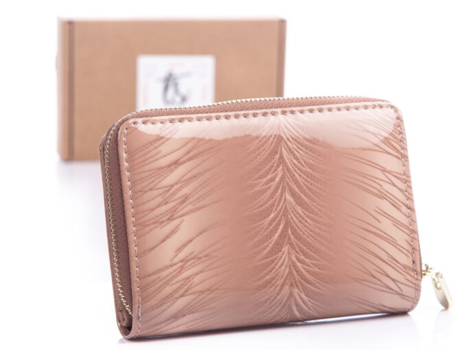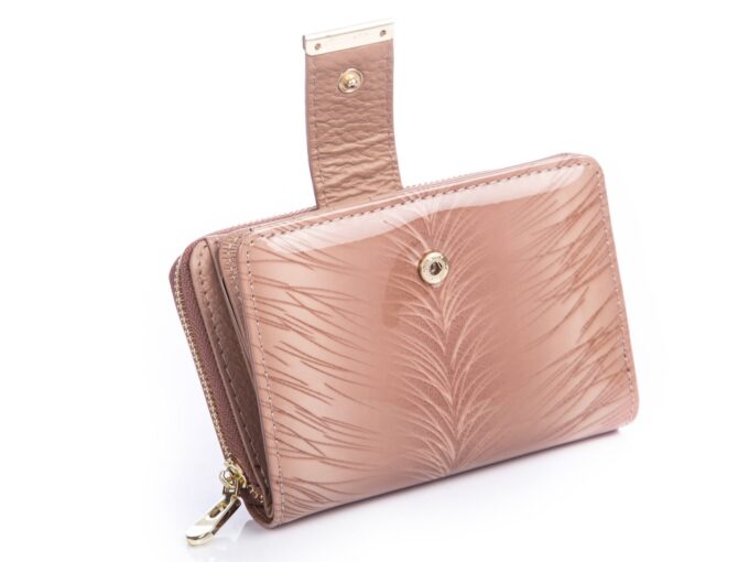 - Kremowy portfel damski lakierowany z delikatnym eleganckim wzorkiem przypominającym piórka.