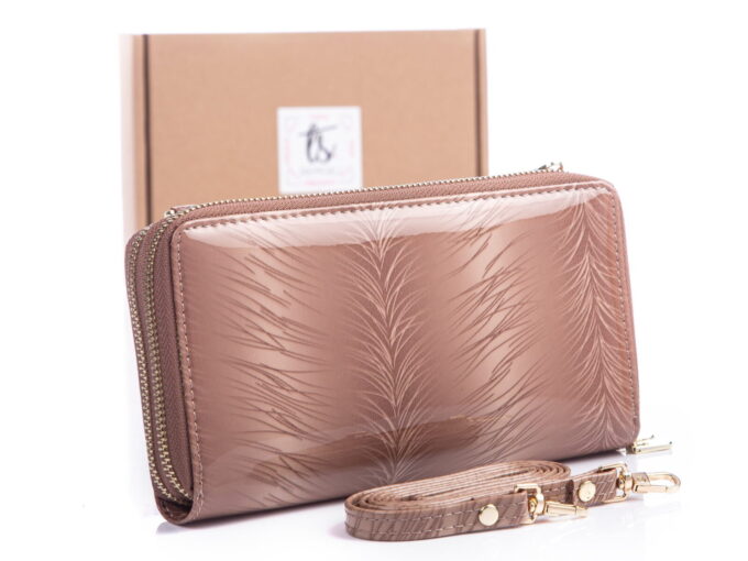 Beżowy portfel damski lakierowany z paskiem na ramię w piórka Jennifer Jones