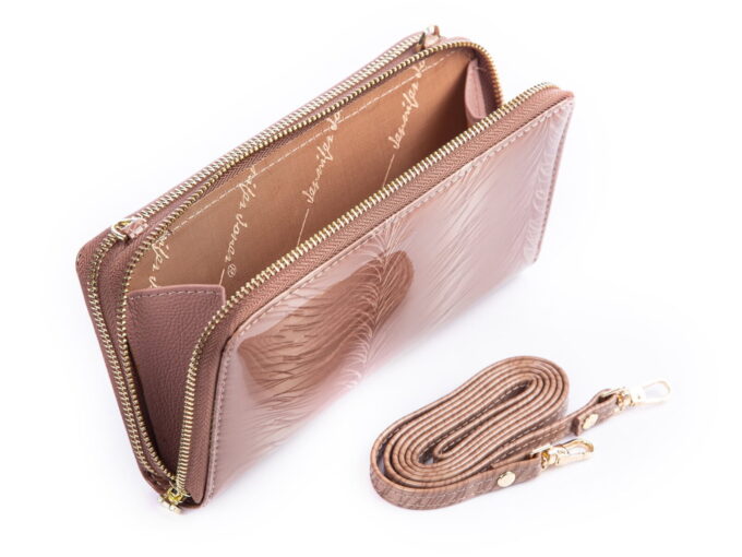 - Lakierowany portfel damski z długim paskiem na ramię pozwalającym na noszenie go w formie kopertówki, małej torebki.