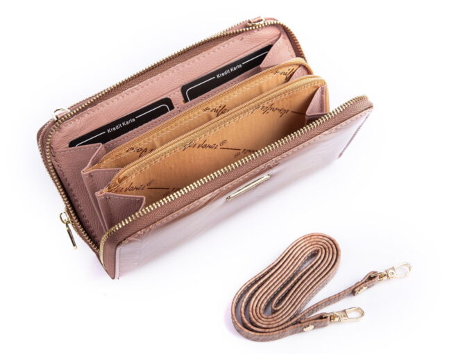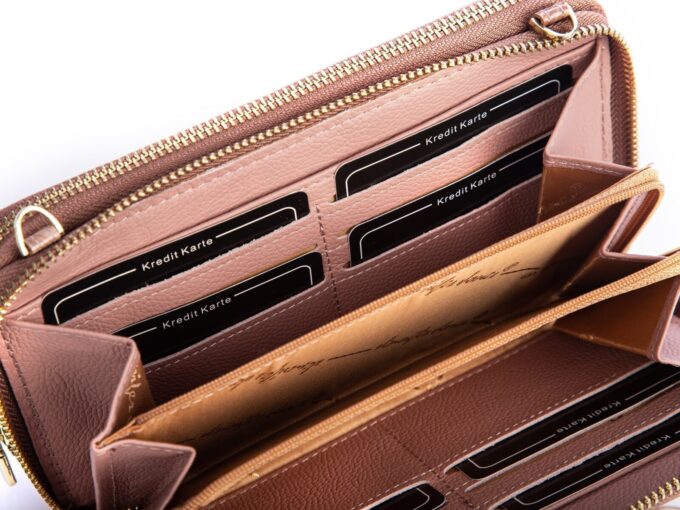 - Portfel posiada długi i odczepiany pasek na ramię, dzięki czemu możemy z niego korzystać jak z małej torebki.