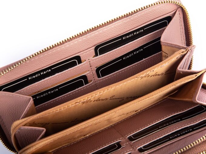 - Wewnątrz drugiej komory znajdują się kieszonki na karty płatnicze, miejsce na banknoty i kieszeń zapinana na suwak.
