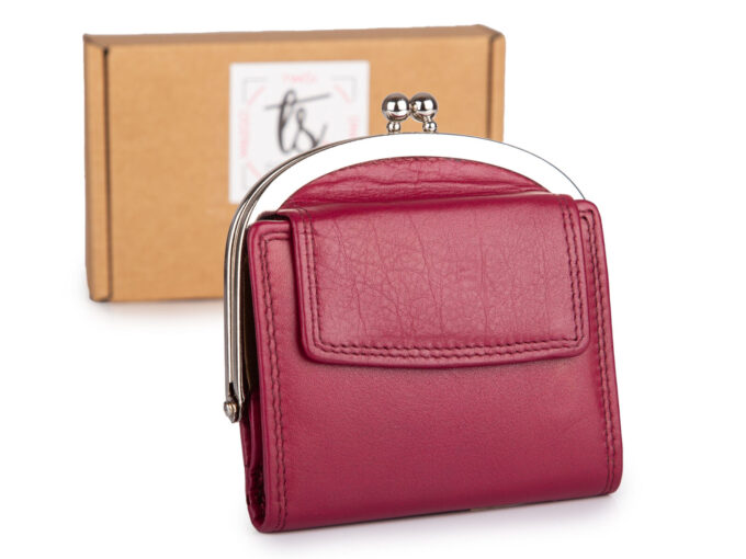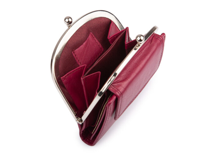 - Bordowa, skórzana, portmonetka damska z kieszenią na monety zapinaną na klasyczny, metalowy bigiel.
