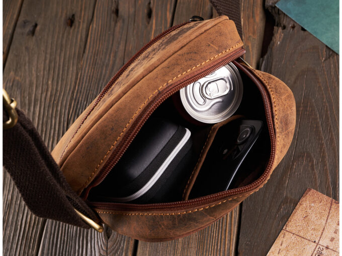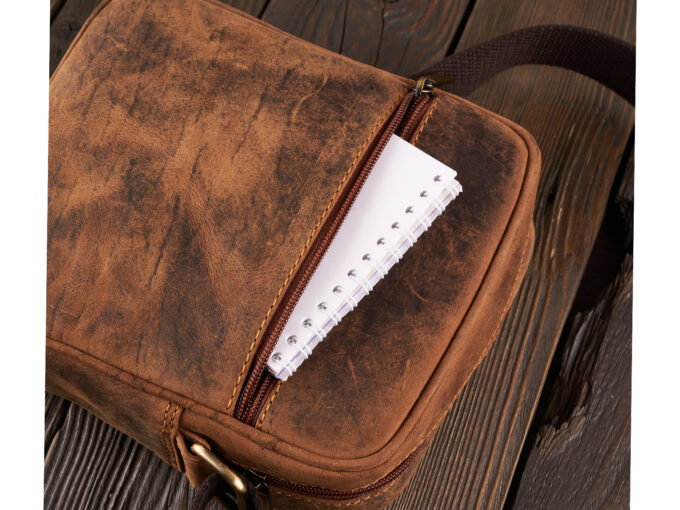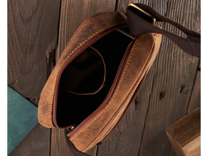 - Brązowa, mała, skórzana saszetka męska na ramię.