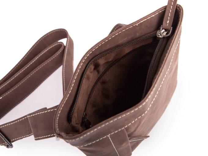 - Torba wyposażona jest w długi i regulowany pasek na ramię wykonany ze skóry.
