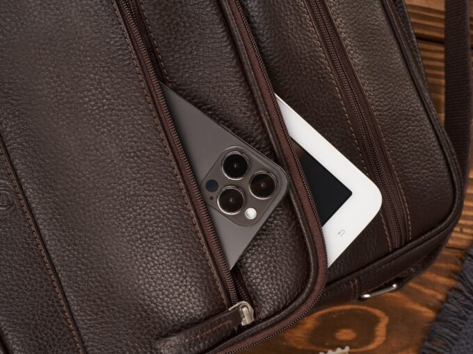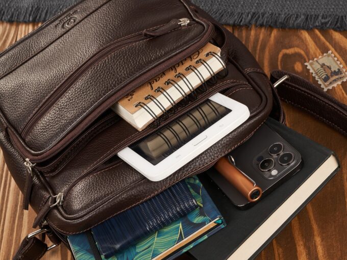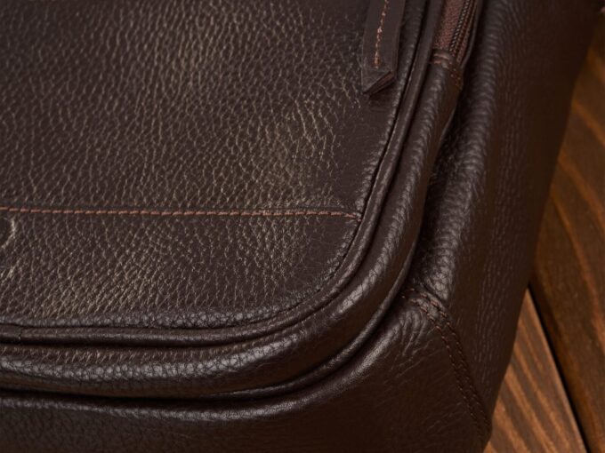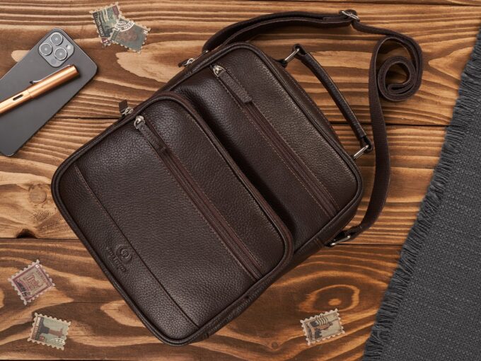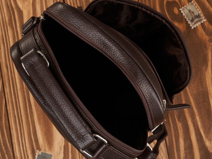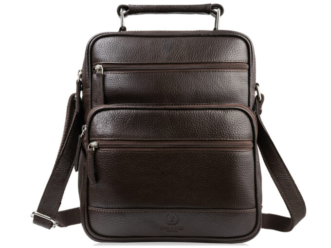 Ciemnobrązowa, pionowa torba męska Paolo Peruzzi z mięsistej skóry naturalnej o subtelnej groszkowej fakturze, z pojemną komorą zapinaną na zamek, wewnętrzną kieszenią na zamek i przegródkami na telefon, dużą przednią kieszenią oraz regulowanym skórzanym paskiem, skórzaną rączką i solidnymi metalowymi okuciami — elegancka i praktyczna na co dzień oraz do pracy. Pełna specyfikacja ⬇