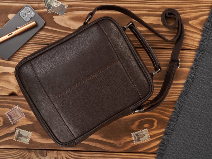 - Ciemnobrązowa, elegancka pionowa torba męska na ramię ze skóry naturalnej.