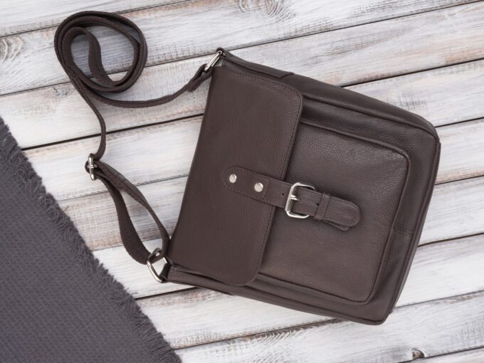- Ciemnobrązowa, listonoszka męska na ramię uszyta ze skóry naturalnej.