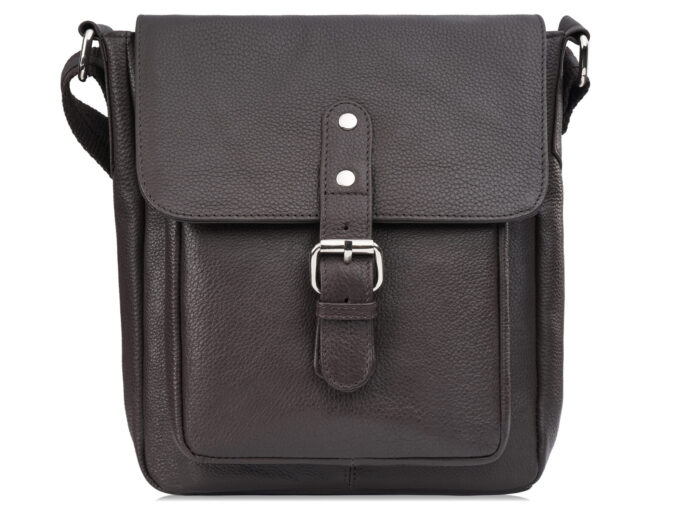 Ciemnobrązowa, średniej wielkości listonoszka męska Paolo Peruzzi z naturalnej skóry o subtelnej groszkowej fakturze (20×24×11 cm) — klasyczny model na co dzień z klapką zamykaną magnetycznie i ozdobną klamrą, trwałymi metalowymi okuciami, praktycznym wnętrzem (kieszeń na zamek i kieszeń na telefon) oraz regulowanym, szerokim paskiem dla wygodnego noszenia. Pełna specyfikacja ⬇