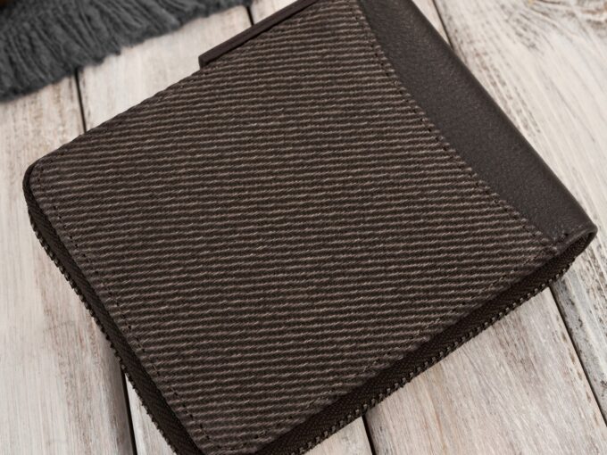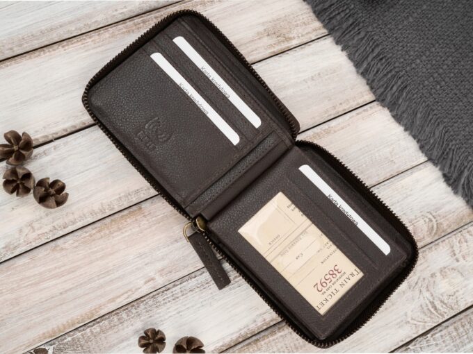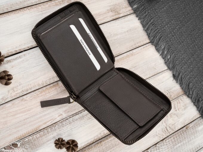 - Ciemnobrązowy, pojemny portfel męski zapinany dookoła na zamek błyskawiczny, poziomy.