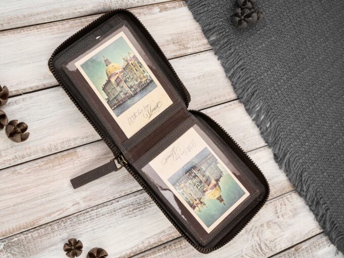 - Portfel zapinany jest dookoła na metalowy suwak.