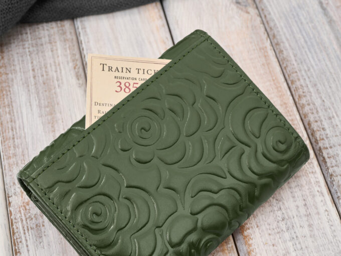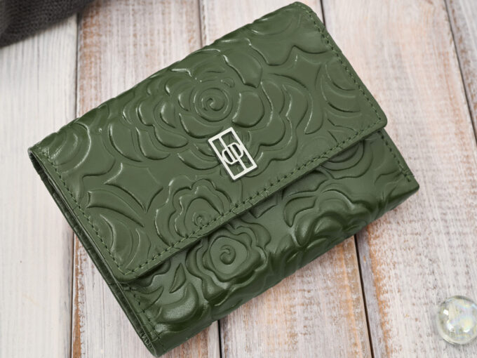- Ciemnozielony, średni portfel damski skórzany z wzorem w tłoczone kwiaty.