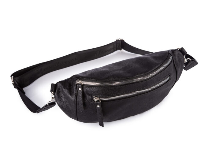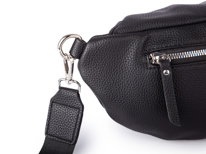 - Duża czarna saszetka damska typu nerka z paskiem na ramię.