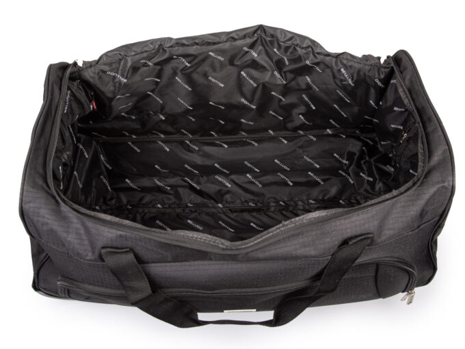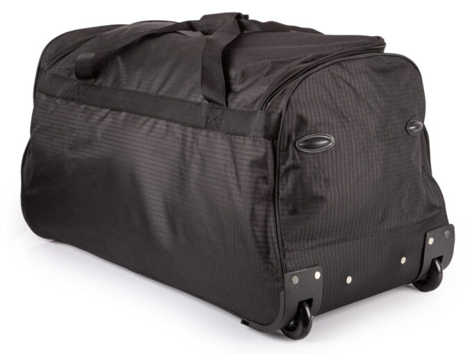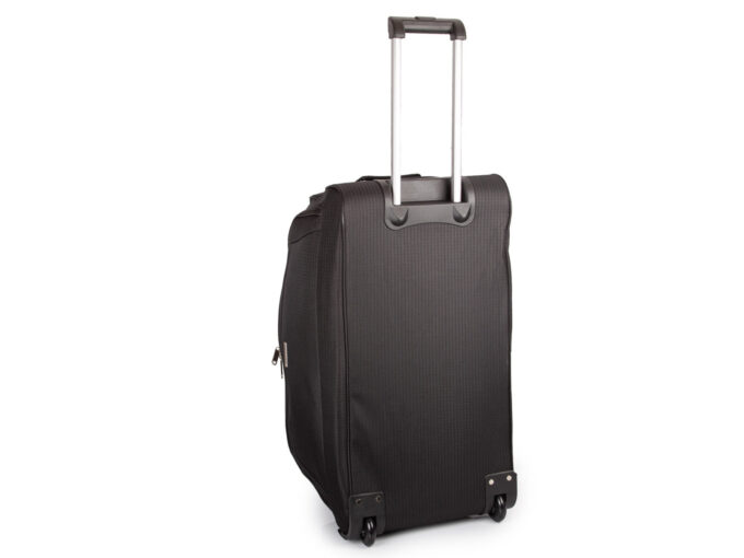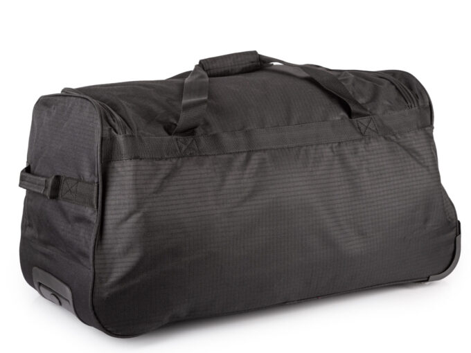 - Czarna, duża torba podróżna na kółkach ze stelażem i wysuwaną rączką.