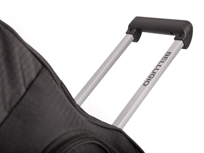 - Z tyłu torby znajduje się aluminiowa, wysuwana rączka. Ma ona wysokość około 22 cm (Przy rozłożonej rączce wysokość torby i rączki wynosi 89 cm).