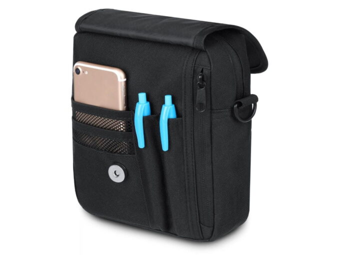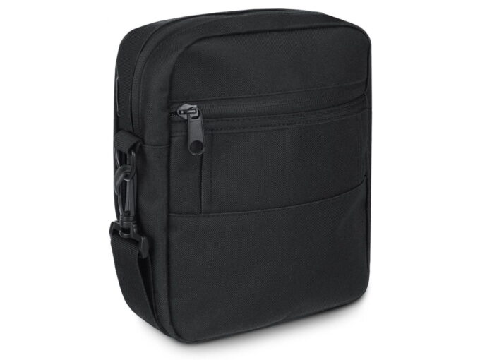 - Saszetka posiada długi, regulowany i odpinany pasek na ramię.