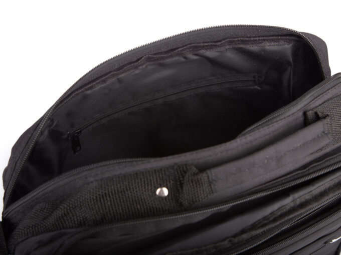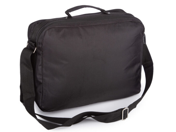 - Czarna, materiałowa torba męska do pracy.