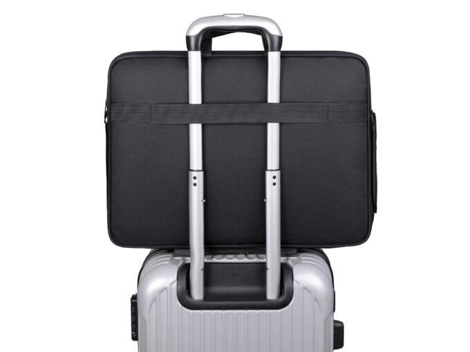 - Z tyłu torby znajduje się mocowanie na uchwyt walizki podróżnej.
