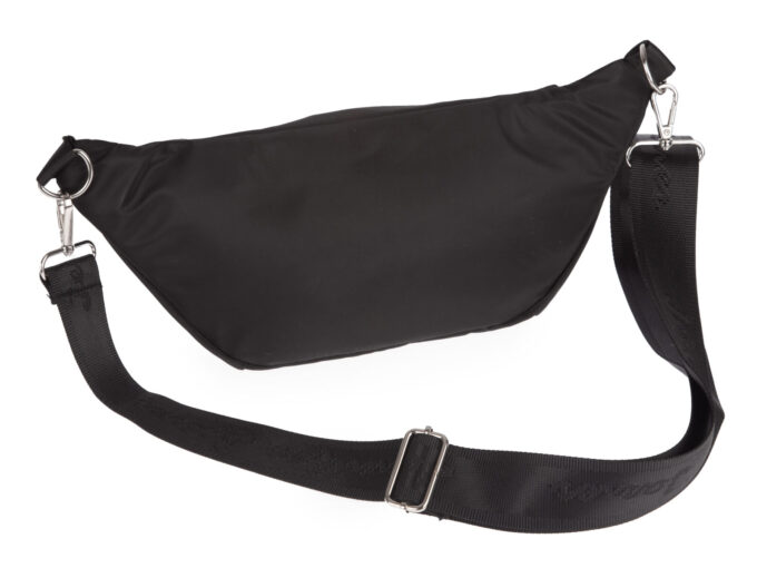 - Czarna saszetka „nerka” damska z paskiem na ramię.