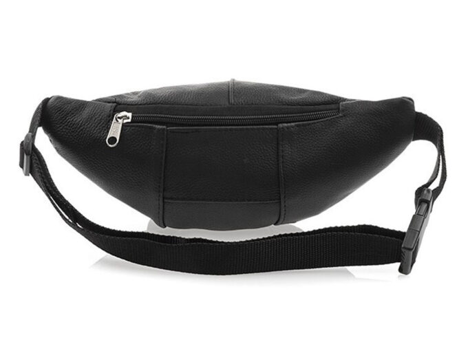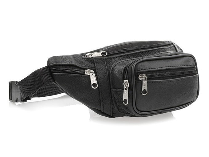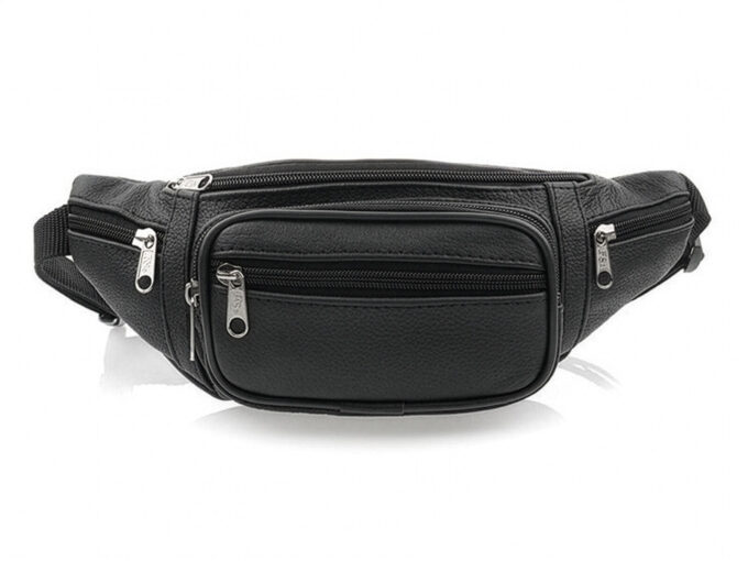 - Czarna, skórzana saszetka biodrowa typu nerka.