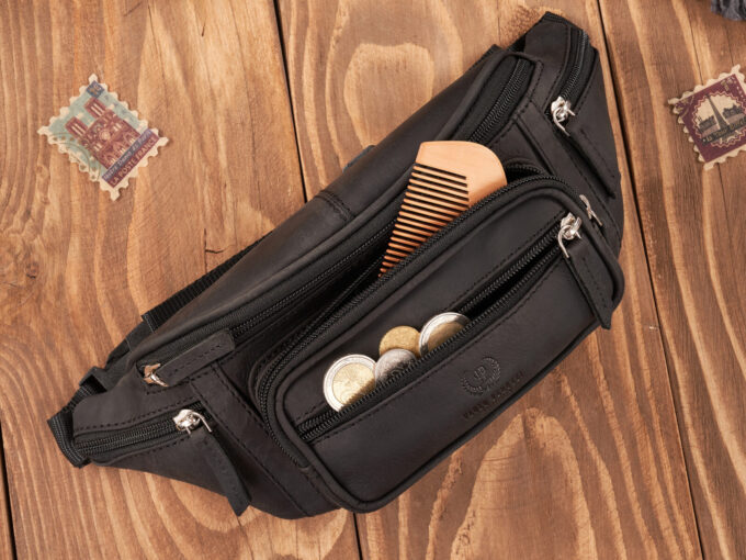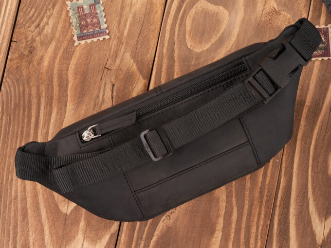 - Czarna, skórzana, saszetka męska biodrowa typu nerka.