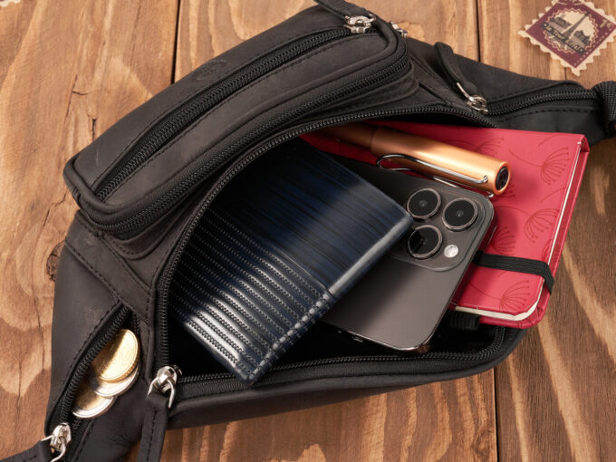- Dodatkowa kieszeń tzw. „antykradzieżowa” z tyłu saszetki, także zapinana na suwak. Gdy mamy założoną saszetkę, to kieszeń ta przylega do naszego ciała ograniczając w ten sposób możliwość dostępu do niej bez naszej naszej wiedzy.