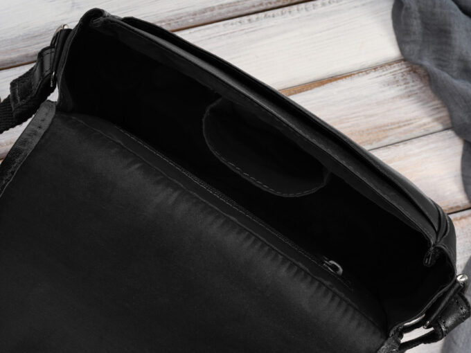 - Pod klapką znajduje się pojemna komora główna, wyłożona elegancką, materiałową podszewką zabezpieczającą.