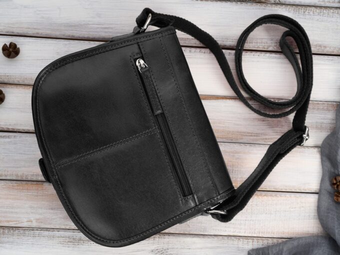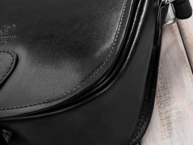 - Torebka wyposażona jest w długi i regulowany pasek na ramię stworzony ze skóry naturalnej podszytej mocnym, bawełnianym materiałem.