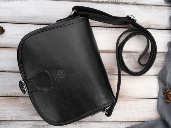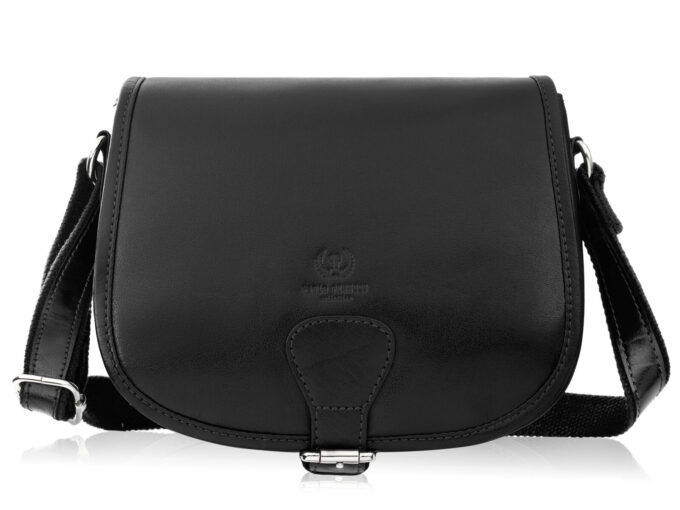 Czarna, półokrągła torebka damska Paolo Peruzzi z grubej skóry licowej — elegancka listonoszka (23×20×9 cm) z klapką zapinaną na paseczek z magnetycznym zatrzaskiem i ozdobną chromowaną sprzączką, pojemną komorą z materiałową podszewką, kieszonką na telefon, kieszenią na zamek oraz tylnym suwakiem i długim regulowanym paskiem podszytym bawełną, idealna na wieczorne wyjścia i do codziennego użytku. Pełna specyfikacja ⬇