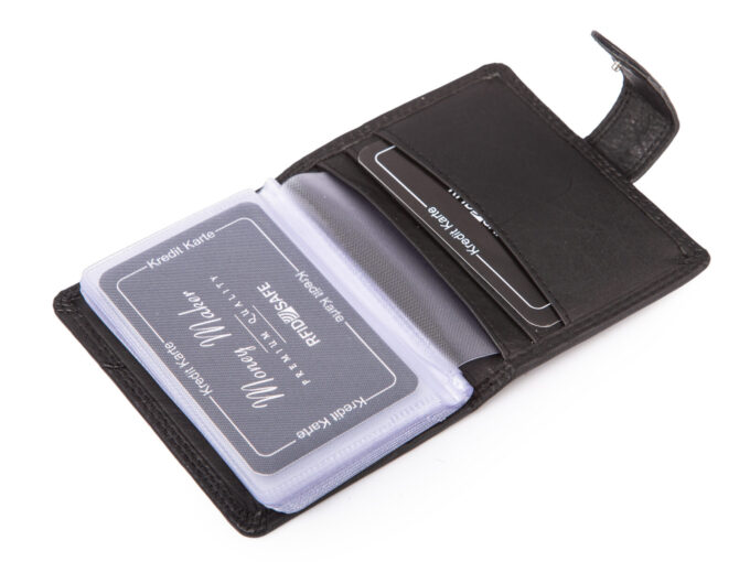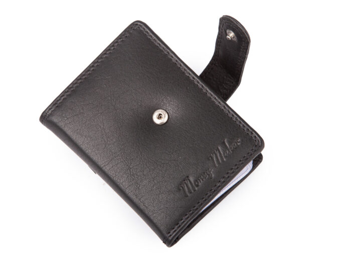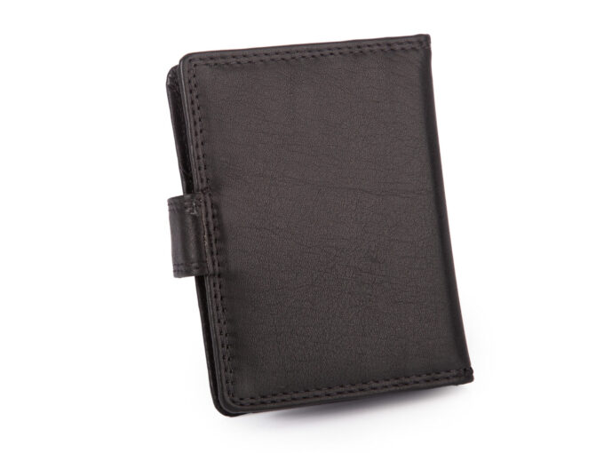 - Czarne, skórzane etui na karty płatnicze, kredytowe, lojalnościowe i dokumenty wielkości dowodu osobistego i prawa jazdy.