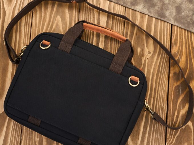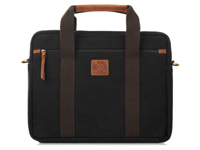 - Czarno-brązowa torba męska do pracy, z kieszenią na laptopa, z canvasu i skóry naturalnej.
