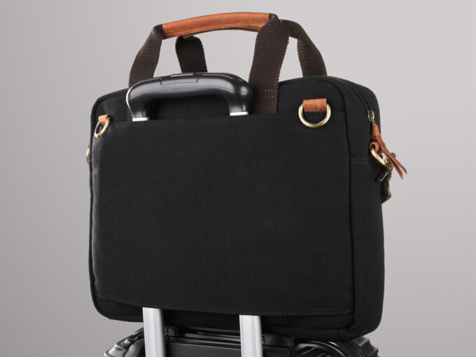 - Z tyłu znajduje się uchwyt do zamocowania torby na stelażu walizki podróżnej.