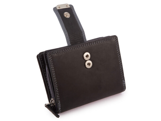 - Portfel zapinany jest na paseczek z metalowymi zatrzaskami.