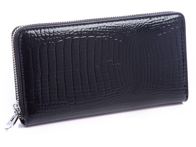 - Pojemny, czarny portfel damski wykonany ze skóry naturalnej lakierowanej.