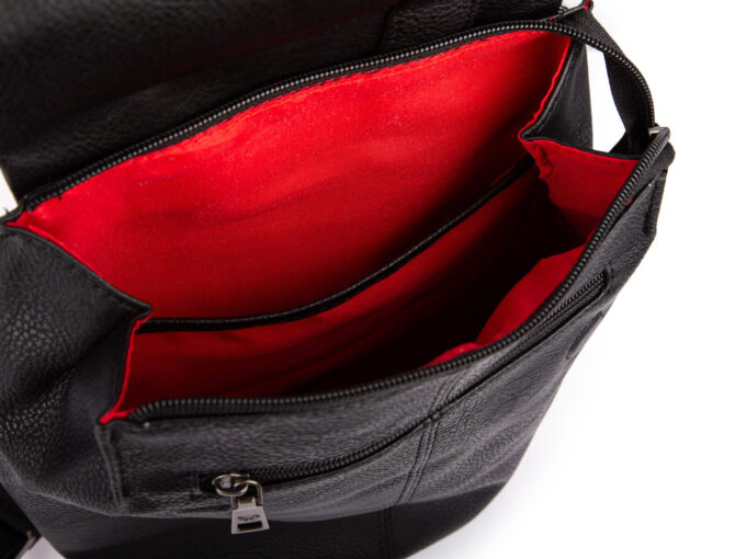 - Pod klapą znajduje się komora główna zapinana na zamek błyskawiczny, oraz przednia kieszonka na podręczne przedmioty, również zapinana na suwak.