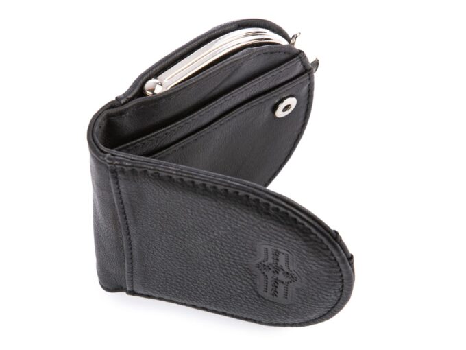 - Kieszeń na monety zapinana jest za pomocą mocnego, metalowego bigla.