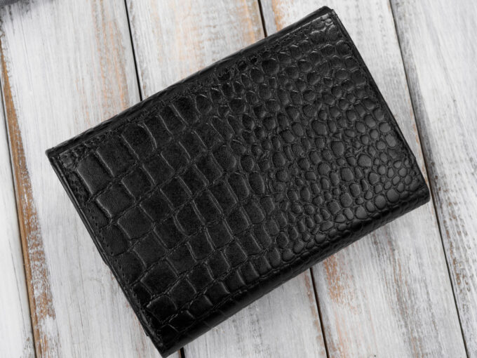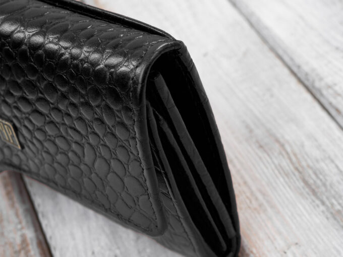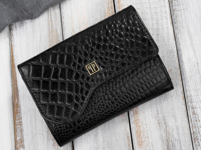 - Czarny, średni portfel damski skórzany z wzorem imitującym skórę krokodyla.